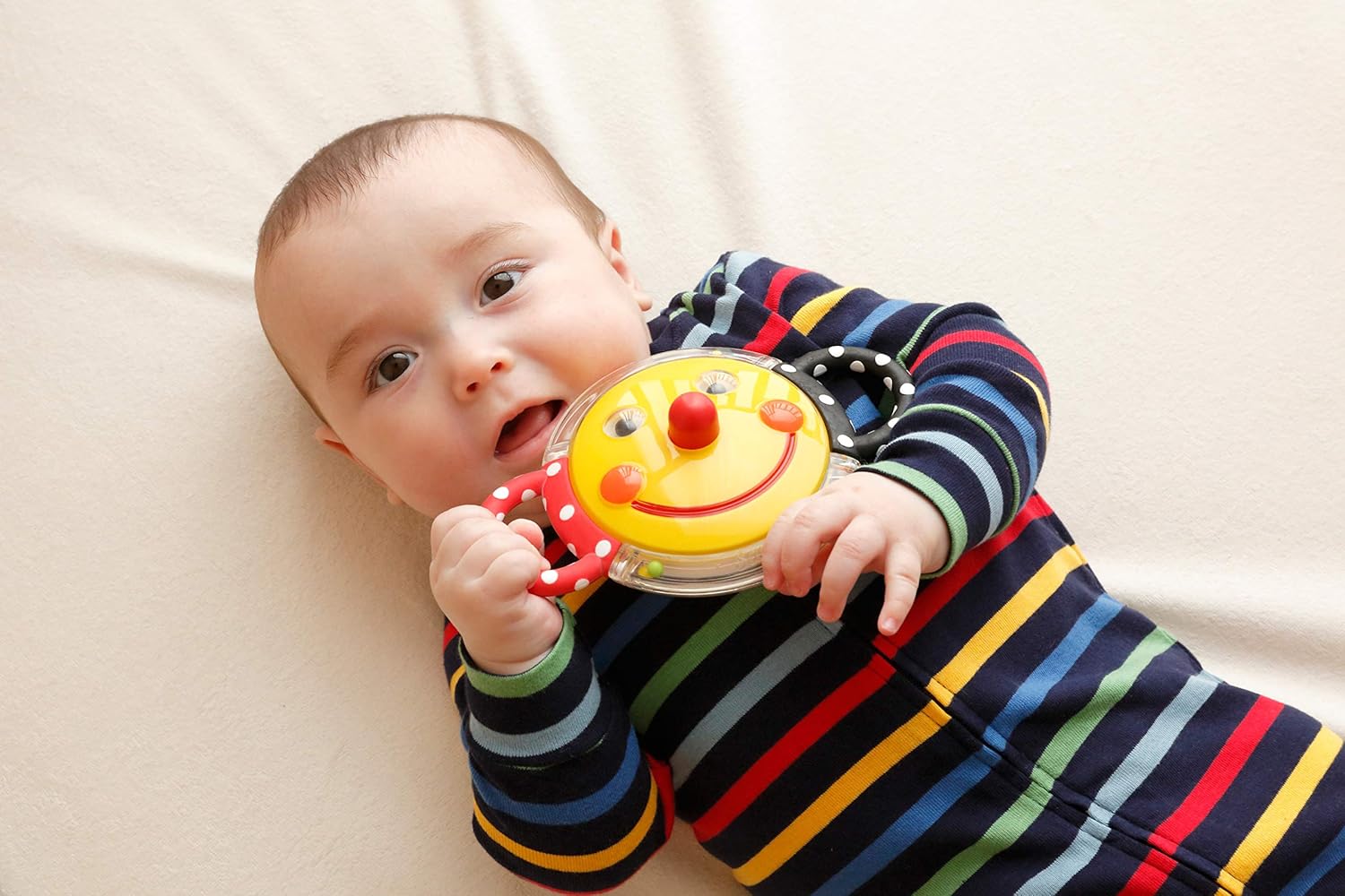 左右対称のにっこりフェイスは、赤ちゃんの目が認識しやすい顔の作り、そして白と黒のハイコントラストの色合いに配慮されています。